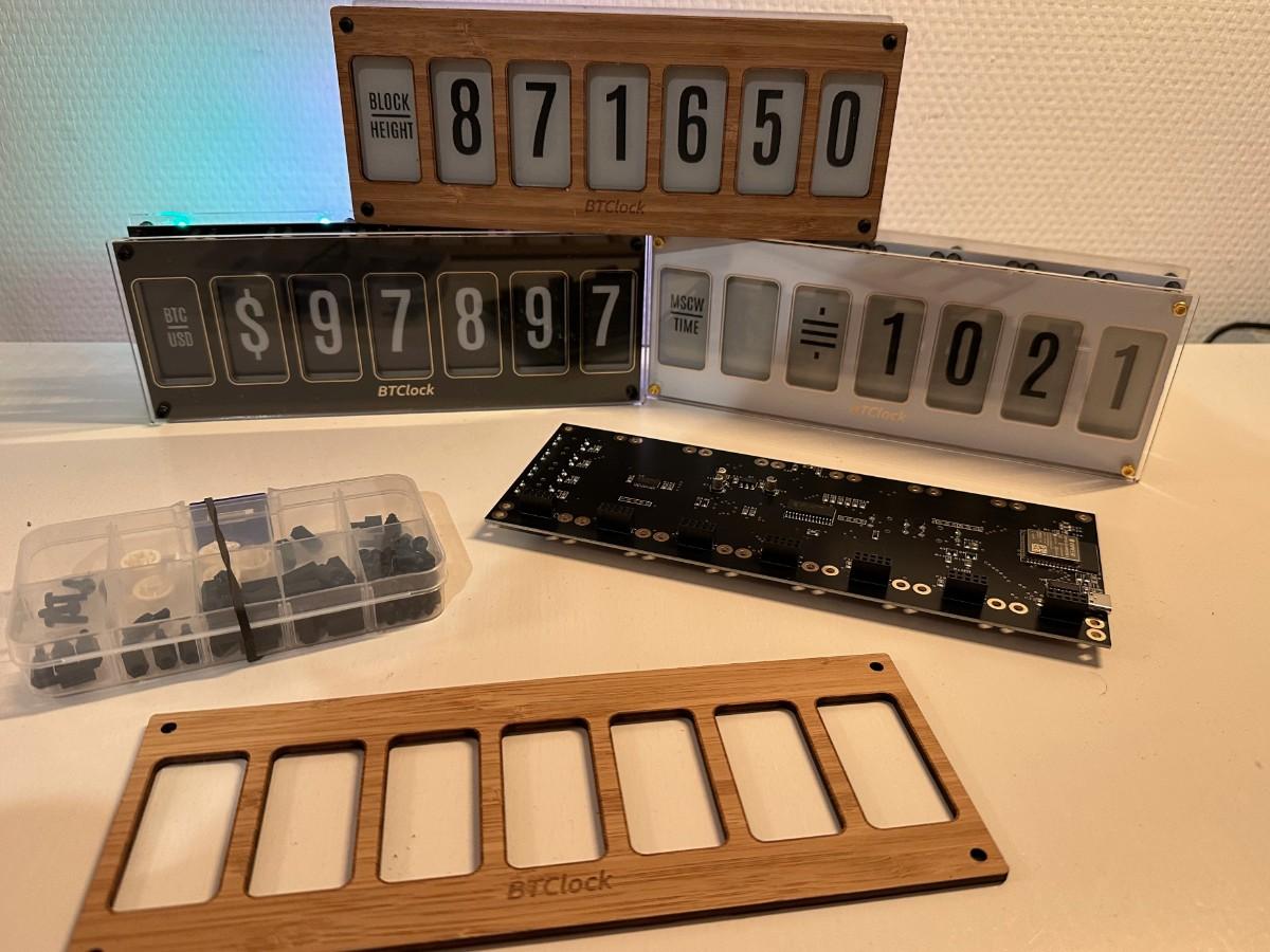 The BTClock is an open‑source Bitcoin information display that brings real‑time, on‑chain and market data into your home or office using a vertical block‑shaped frame of seven e‑Ink panels. Controlled by an ESP32‑based board, it quietly updates key Bitcoin metrics on an always‑on, low‑power display that reads clearly in daylight and under its integrated front‑light.